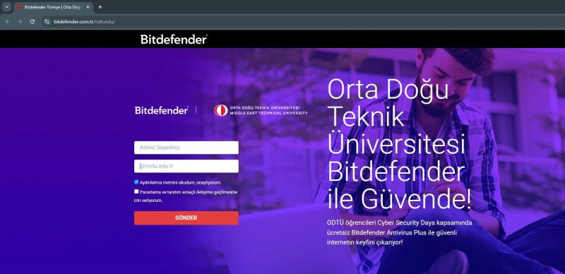 https://bitdefender.com.tr/odtuedu adresinden giriş sağladıktan sonra ad soyad bilgilerinizi ve öğrenci e-posta adresinizi “exxxxxx@metu.edu.tr” şeklinde girerek “Gönder” butonuna basınız.