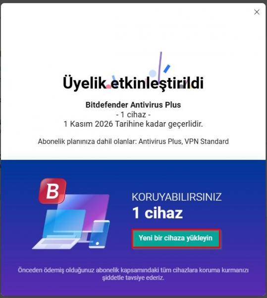 “Üyelik etkinleştirildi” uyarısı ile karşılaştıktan sonra “Yeni Bir Cihaza Yükleyin” butonuna basarak indirme işlemine başlayabilirsiniz.