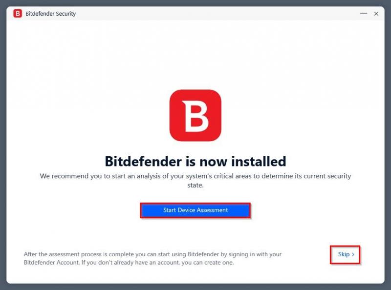 Kurulum tamamlandıktan sonra gelen ekranda “Start Device Assessment” butonuna tıklayarak cihazınızı güvenlik taramasından geçirebilirsiniz veya “Skip” seçeneğine tıklayarak bu işlemi daha sonra yapabilirsiniz.