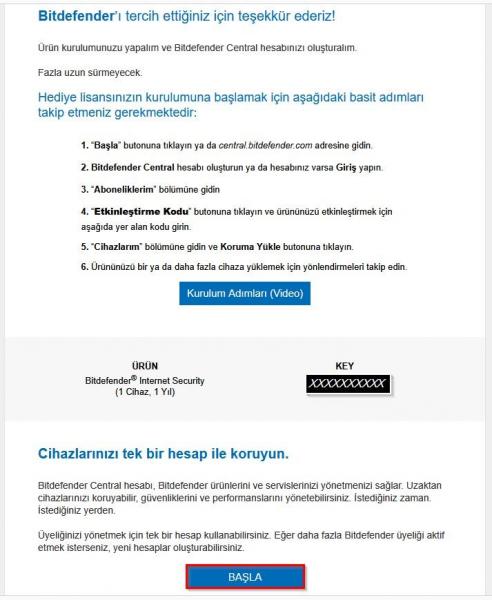 E-postanın alt kısmında bulunan “Başla” butonuna basınız ve ardından “Bitdefender Central” web sayfasının yüklenmesini bekleyiniz.