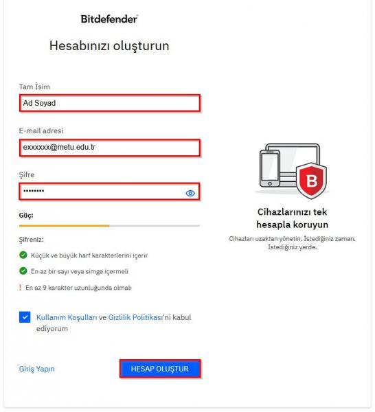 Kullanıcı bilgilerinizi ve parolanızı girerek yeni “Bitdefender Central” hesabı oluşturunuz.