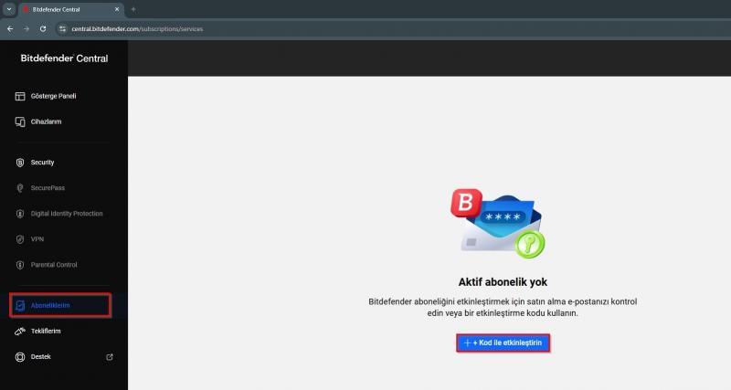 Onaylama işleminden sonra sistem sizi otomatik olarak Bitdefender Central hesabınıza yönlendirecektir. İlgili sayfa üzerinde “Aboneliklerim” ardından “Kod ile Etkinleştirin” butonuna basınız.